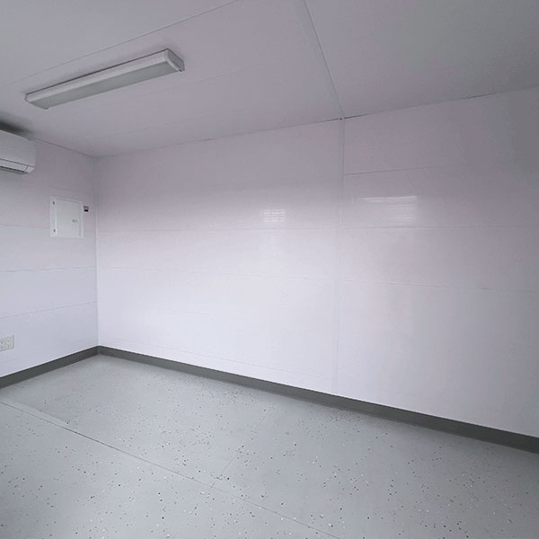 Two windows bring in natural light, and the 40″ x 80″ insulated metal door ensures secure, easy access. Inside, the walls and ceiling are fully insulated and finished with bright, low-maintenance PVC cladding. The floor is protected with a durable epoxy coating, offering long-term wear resistance and easy cleaning.